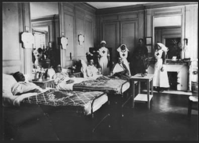 Within a short distance of the little hospital was a beautiful Louis Seize house with a terrace, a lovely garden and a fountain turned on at will. An atmosphere of powder and patches pervaded the whole place (once the French Troops, Moroccans and later refugees housed there from Northern France had left, and all trace of their presence had been removed by soap, water and whitewash). The representatives of the ‘Societe de Bienfaisantes’ who owned the house, were approached and consented to let it to the Joint Committee at a small rent. It was necessary to do a great deal in the way of repairs but the Sub-Committee of the British Red Cross Society made arrangements with the Royal Engineers to carry out the work on repayment of the material used and all the districts lent any skilled carpenters etc. they could to help in any way.
